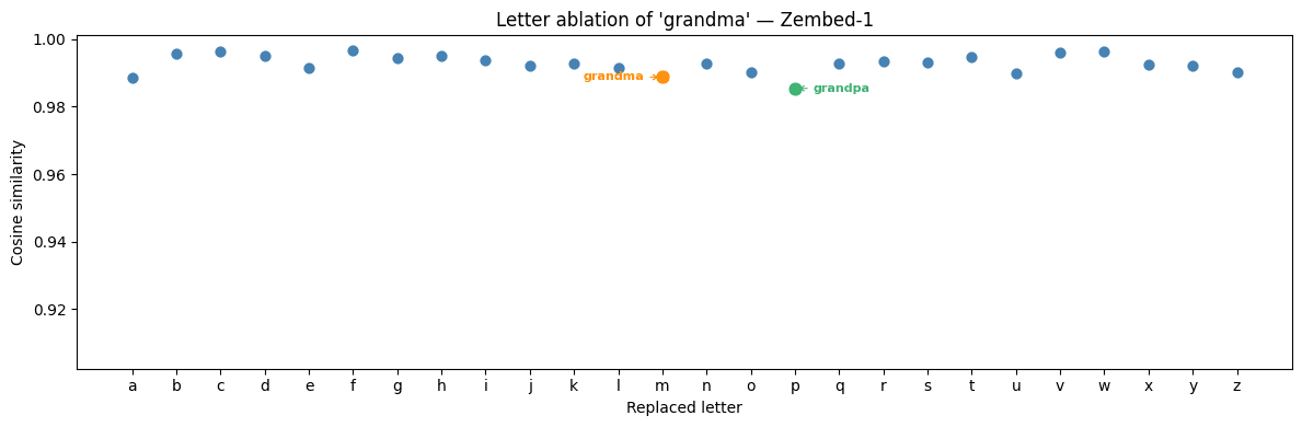 Since grandpa and grandma differ by a single letter, we can run all 26 lower-case letter ablations of grandma (i.e. grandma, grandba, grandca, ...) to check whether the effect is phonetic or semantic.