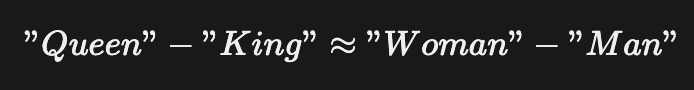"Queen" ≈ "King" - "Man" + "Woman""Queen"≈"King"−"Man"+"Woman"