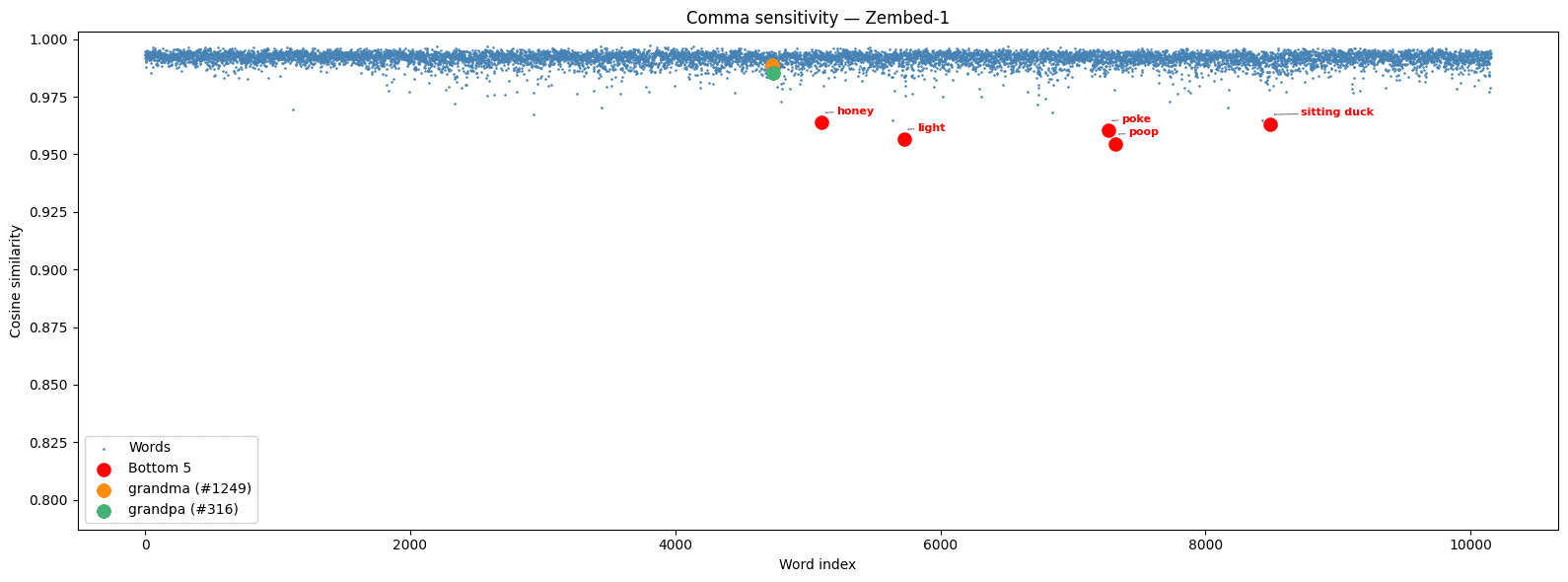 Most nouns cluster in a tight band around y = 0.975, meaning the model correctly treats the comma as a minor perturbation. But grandma and grandpa are dramatic outliers, pulled far below the band. And seemingly unrelated words like listener (y = 0.7969) give exceptionally low cosine similarity for no obvious reason.